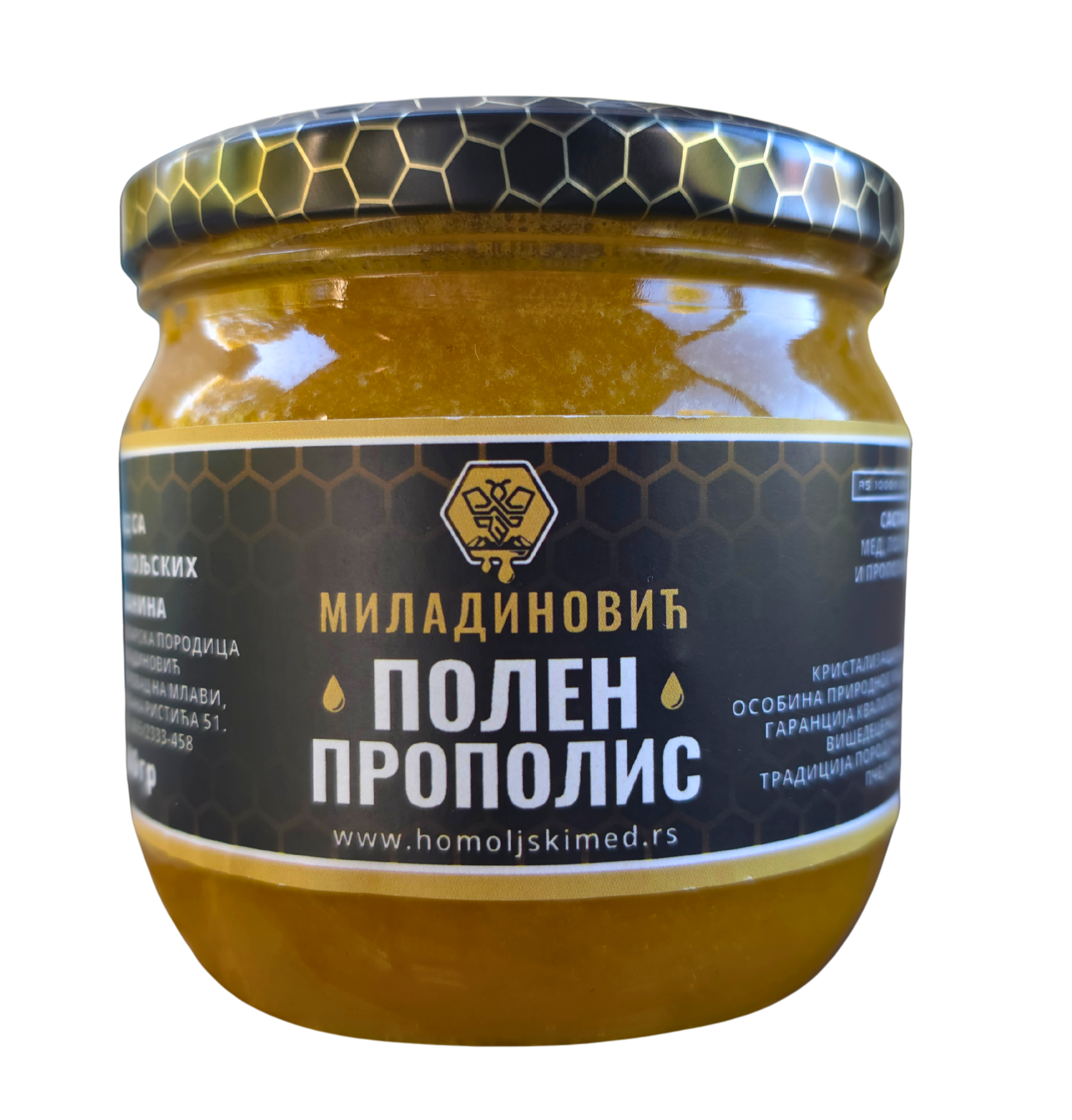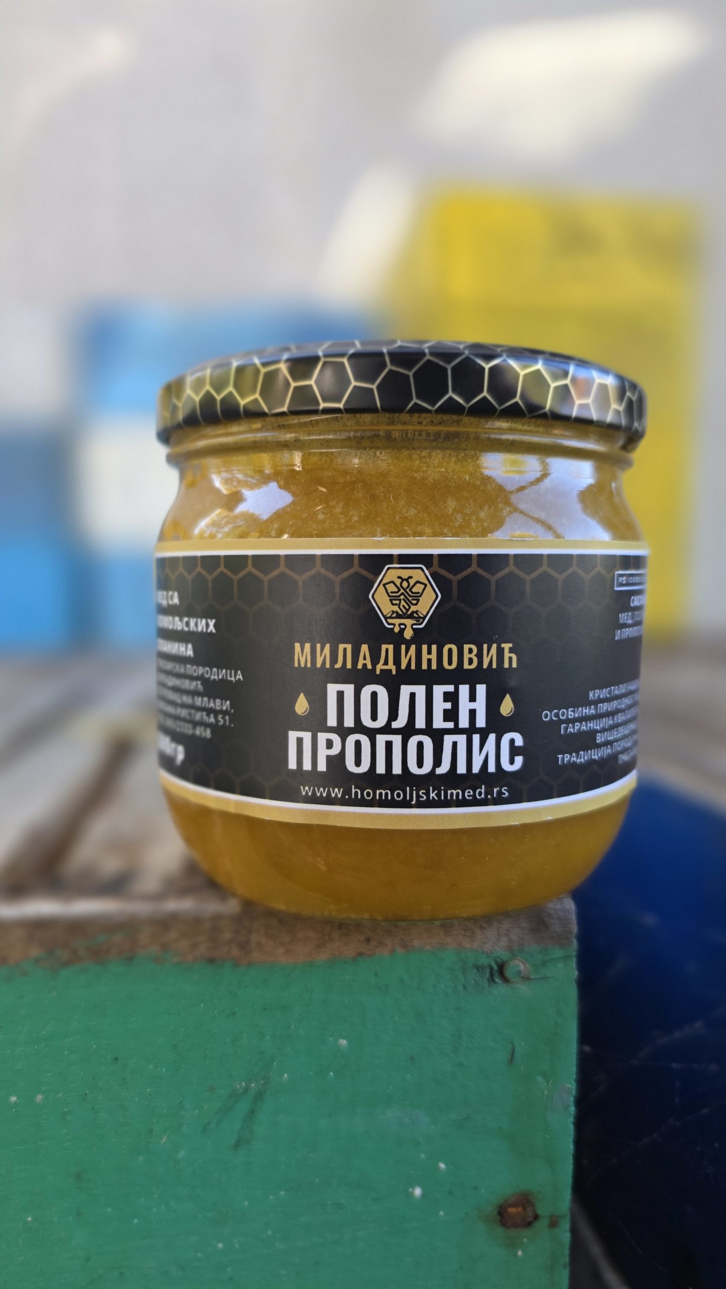Mešavina polenovog praha i propolisa sa Homoljskih planina u livadski medu.Eliksir zdravlja koga priznaje i preporučuje i zvanična medicina.Izuzetna za oporavak oragnizma,rad kardiovaskluranog sistema,digestivnog trakta,jačanje krvne slike.Ova izvanredna životna namirnica je bogata belančevinama, aminokiselinama, vitamina A, B, C te čini smešu od vitalnog značaja za ljudski organizam , neophodna u svakodnevnoj ljudskoj ishrani.